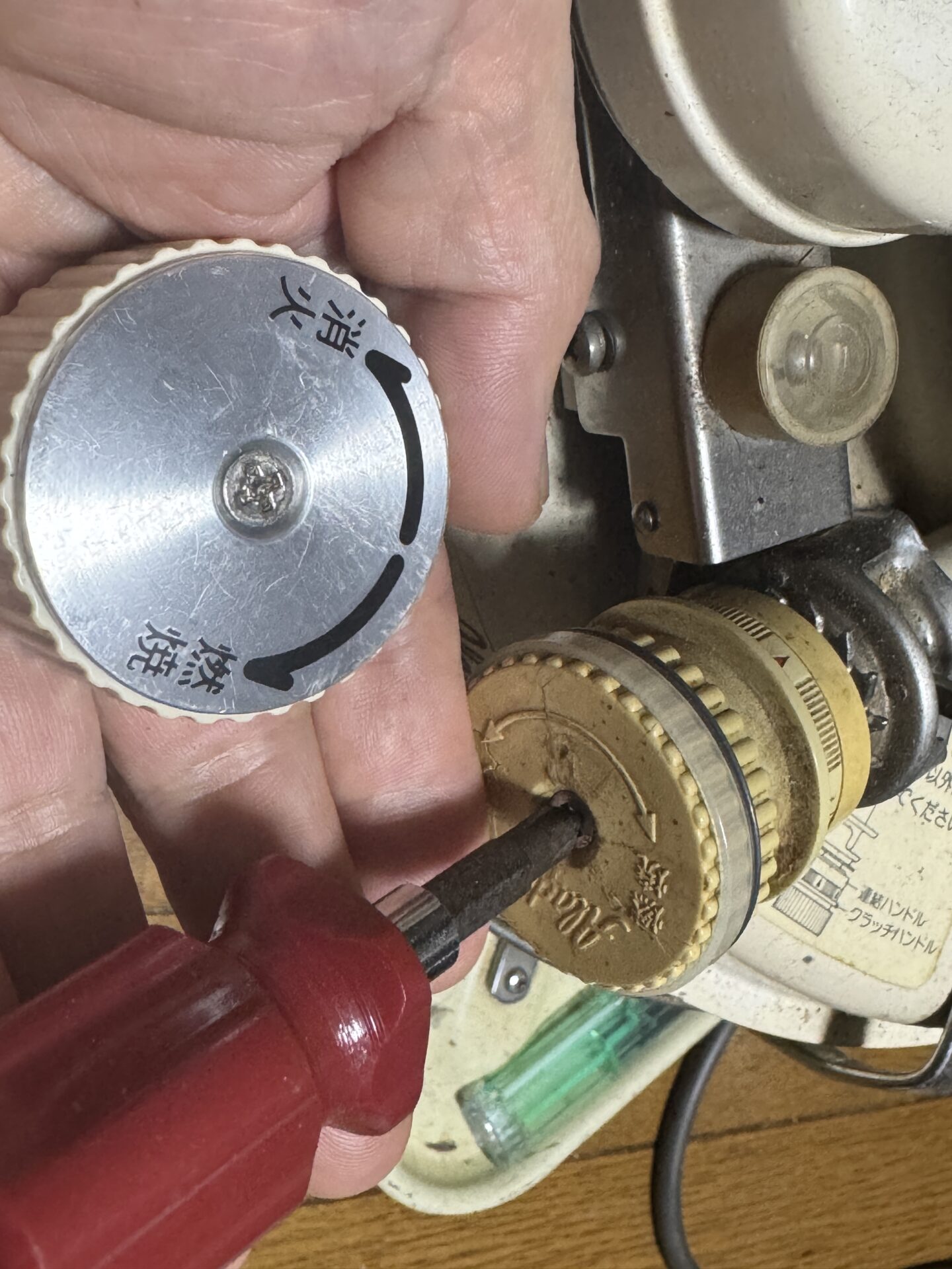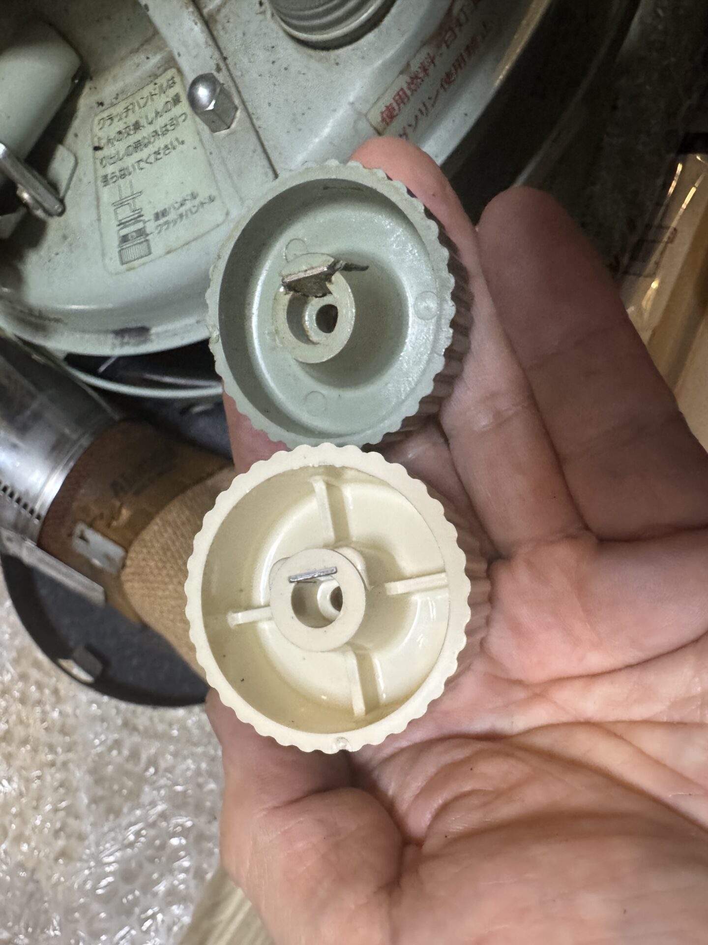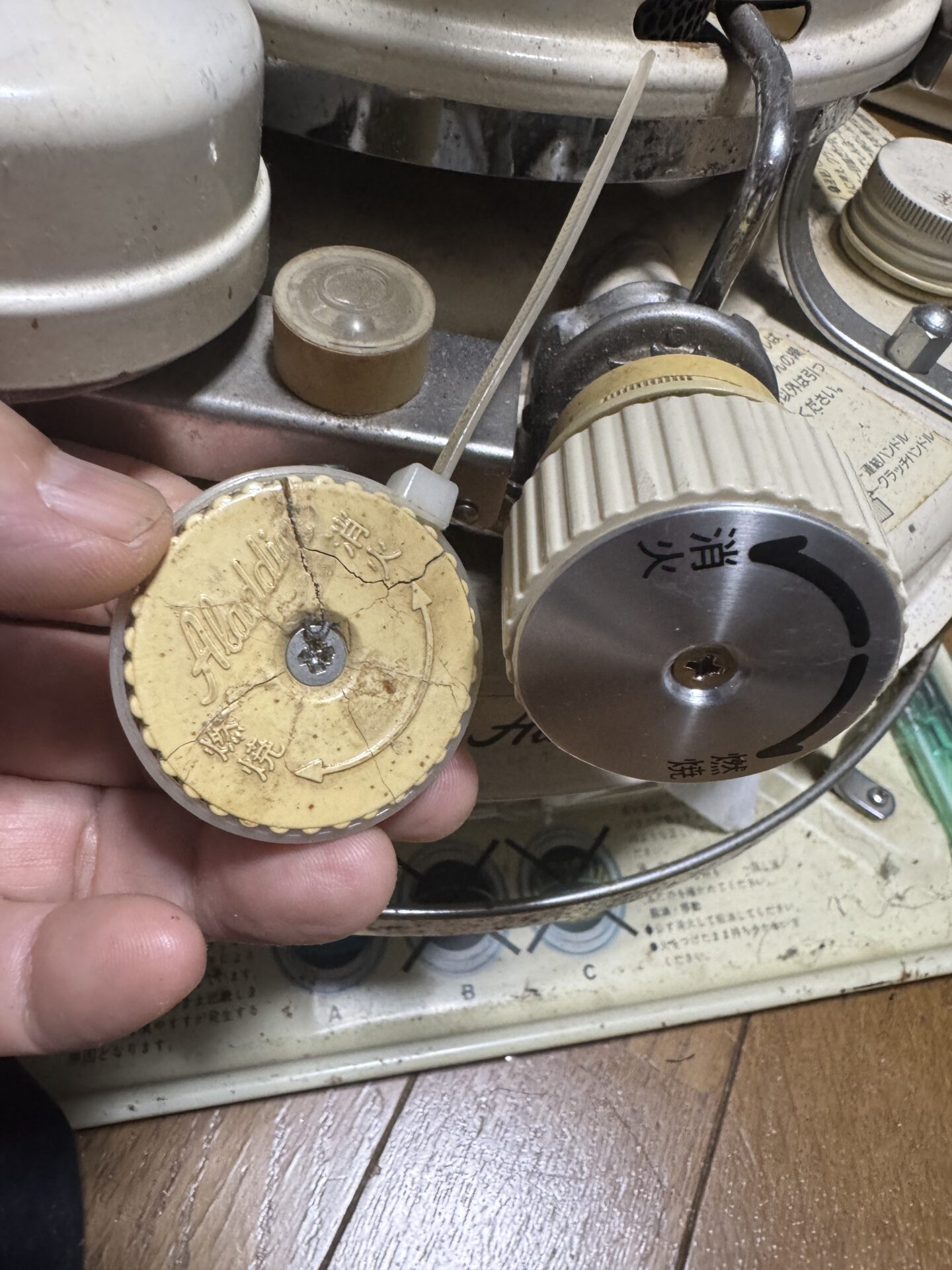 I bought a knob for my old heater, and placed orders other parts, which he currently carried in stock, of the newly purchased one. The Aladdin company doesn’t produce the knob suitable to my old heater, and I needed to modify it as usual. The modification was nothing special– I just lower the height of the knob so that the adjuster dial could be slid on the rotating axis.